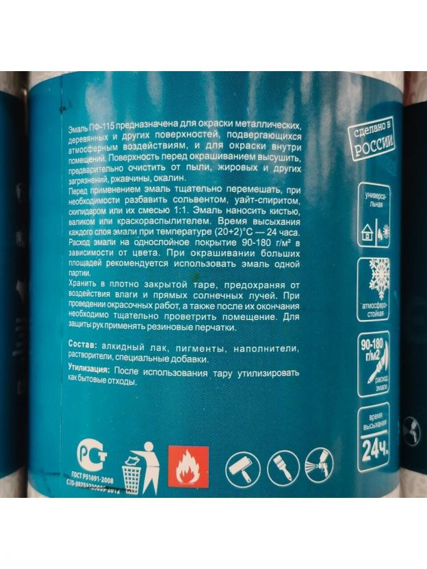 Эмаль ПФ-115 предназначена для окраски металлических, деревянных и других поверхностей, подвергающихся атмосферным воздействиям, и для окраски внутри помещений. Поверхность перед окрашиванием высушить, предварительно очистить от пыли, жировых и других загрязнений, ржавчины окалин.