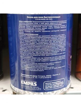 Нанесение: Кистью или валиком на подготовленную сухую, чистую поверхность (на ранее окрашенный пол - один или два слоя, на неокрашенный - два слоя). Инструменты очищать вайт-спиритом сразу после использования.