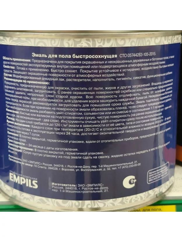 Рекомендации по применению: Поверхность, предназначенную для окрашивания, очистить от пыли, жиров и других загрязнений. Впадины и неровности выровнять шпатлевкой, загрунтовать. С ранее окрашенных поверхностей скребком или специально предназначенной смывкой удалить непрочные слои старой краски. Всю поверхност отшлифовать, пыль от шлифовки удалить. Неокрашенные полы, при необходимости, для удаления ворса зашкурить наждачной бумагой. Неокрашенные бетонные полы перед окраской рекомендуется загрунтовать для повышения срока службы. Эмаль тщательно перемешать до однородности. Если при хранении на поверхности эмали образовалась пленка, то ее следует предварительно удалить. При необходимости разбавить вайт-спиритом, сольвентом или их смесью в соотношении 1:1 по массе.