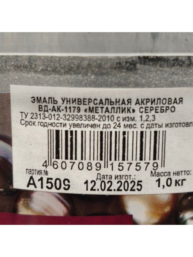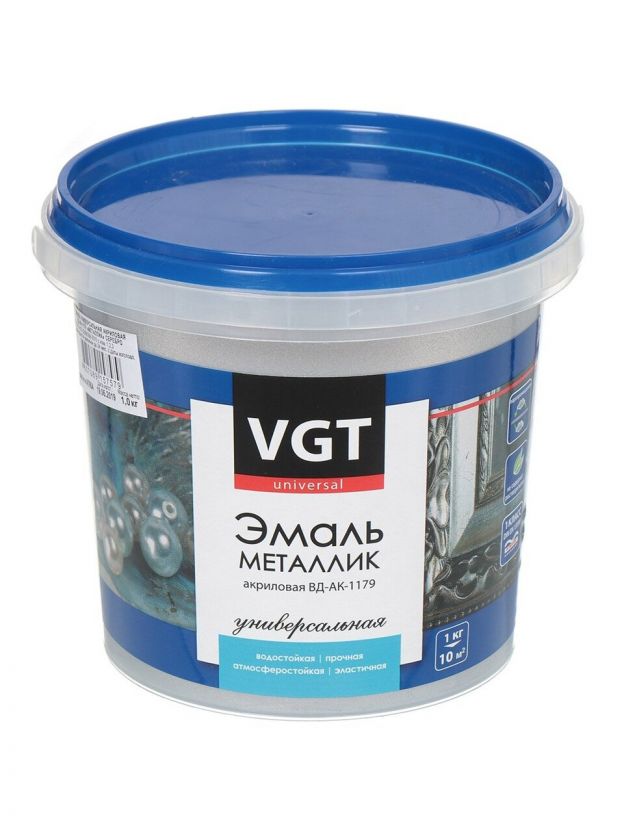 Эмаль VGT, ВД-АК-1179 Металик, универсальная, акриловая, глянцевая, серебро, 1 кг