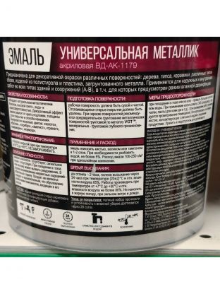 • Свойства и особенности: Обладает натуральным металлическим блеском, высокой свето-, водо- и атмосферостойкостью. Декоративный эффект эмали зависит от цвета подложки, толщины слоя покрытия и способа нанесения. Выпускается нескольких цветов : «золото», «бронза», «серебро», «аметист», «гранат», «аквамарин», «изумруд».