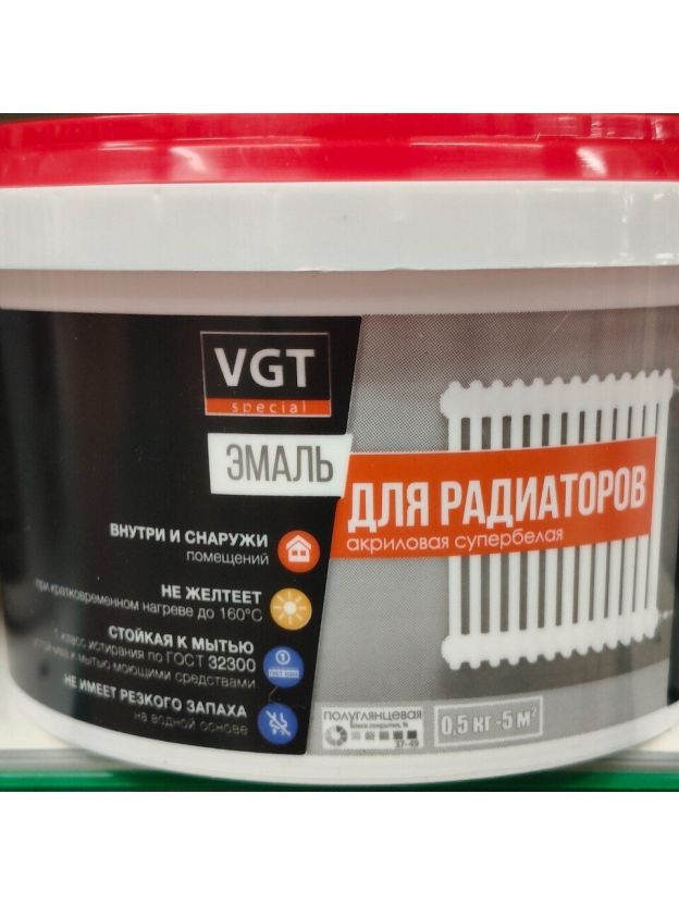 Эмаль VGT, ВД-АК-1179, для радиаторов, акриловая, полуглянцевая, супербелая, 0.5 кг