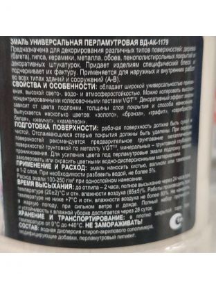 Предназначена для декоративной окраски различных поверхностей (минеральных, дерева, гипса, керамики, различных типов обоев, пенополистирольных покрытий), а также для получения дополнительного декоративного эффекта при отделке других декоративных покрытий, придавая им специфический блеск и подчеркивая их фактуру. Применяется для наружных и внутренних работ. Обладает широкой универсальностью применения, высокой свето-, водо- и атмосферостойкостью. Декоративный эффект эмали зависит от цвета подложки, толщины слоя покрытия и способа нанесения.