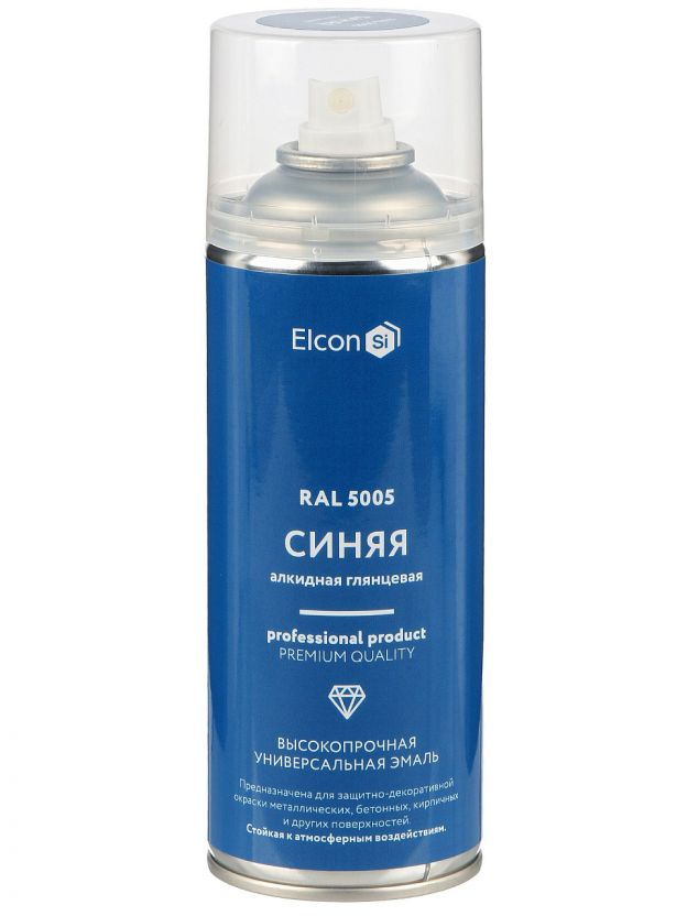Эмаль аэрозоль Elcon RAL 5005: универсальное глянцевое покрытие для любых поверхностей, стойкость к погоде, насыщенный синий цвет, объём 520 мл.