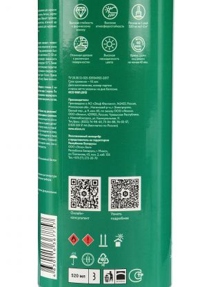 • Экономичный объем — 520 мл хватает на большие площади, равномерное кроющее покрытие, насыщенный зеленый цвет по каталогу RAL 6029.