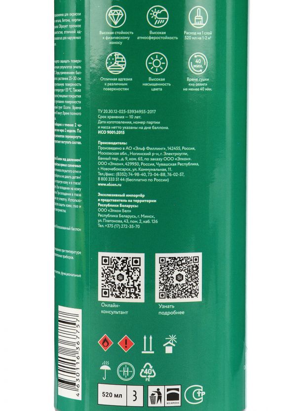 Если вы задаётесь вопросом, чем отличается эта эмаль от других аэрозольных красок, — Elcon сочетает универсальность применения, насыщенный зеленый цвет по стандарту RAL 6029 и удобство использования без разбавителя. Это выгодное решение для тех, кто ценит надежность и простоту.