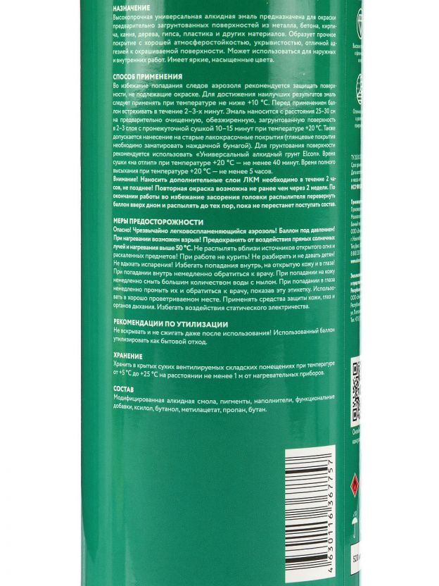 Объем — 520 мл, цвет — насыщенный зеленый (RAL 6029), степень глянца — глянцевая, тип покрытия — кроющий, основа — алкидная, однокомпонентная формула, подходит для металла, дерева, бетона, кирпича, гипсокартона.