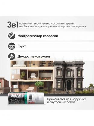 - Благодаря сочетанию свойств нейтрализатора коррозии, грунта и декоративной эмали (3 в 1) позволяет значительно сократить время, необходимое для получения защитного покрытия.