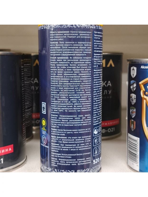 Эмаль алкидная аэрозольная Русские узоры предназначена для окраски различных поверхностей и подходит для нанесения на предварительно загрунтованные металлические, деревянные и иные основания. Благодаря повышенной универсальности, данный лакокрасочный материал подходит как для внутренних, так и для наружных работ. После высыхания образует однородное гладкое долговечное покрытие с хорошей укрывистостью, атмосферостойкостью, превосходной адгезией к окрашиваемой поверхности.