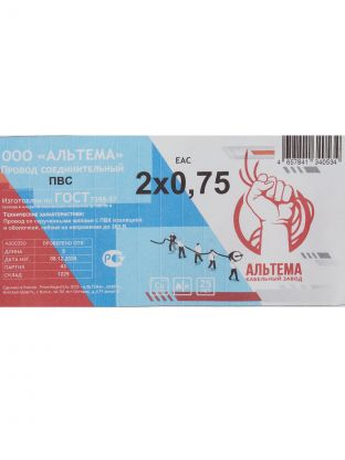 2 медные жилы по 0.75 мм2, длина 5 м, гибкая белая изоляция, стандарт ПВС, сертифицирован по ГОСТ, артикул А000504.