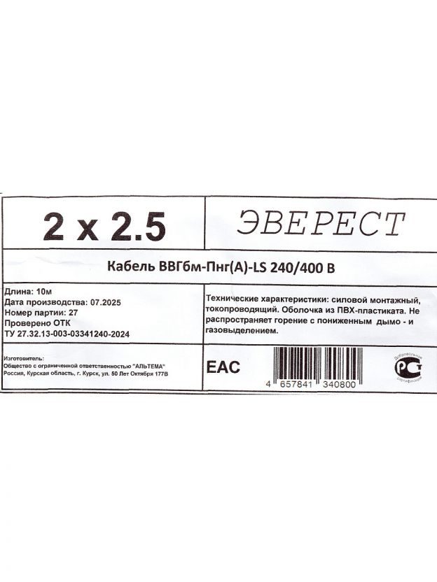 - Оптимальные параметры: 2 медные жилы по 2.5 мм2, длина 10 м, соответствует строгим стандартам ТУ.
