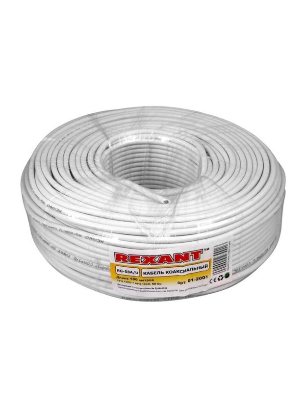 Кабель коаксиальный, 1х0.51 мм2, 100 м, медь, 50 Ом, 64%, белый, Rexant, RG-58 A/U, 01-2001