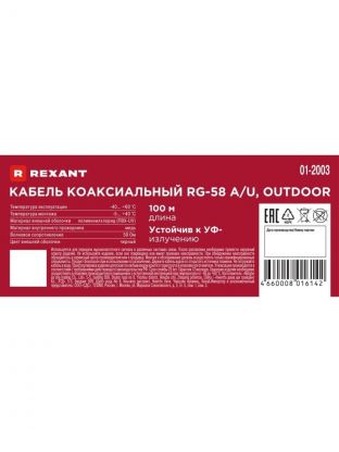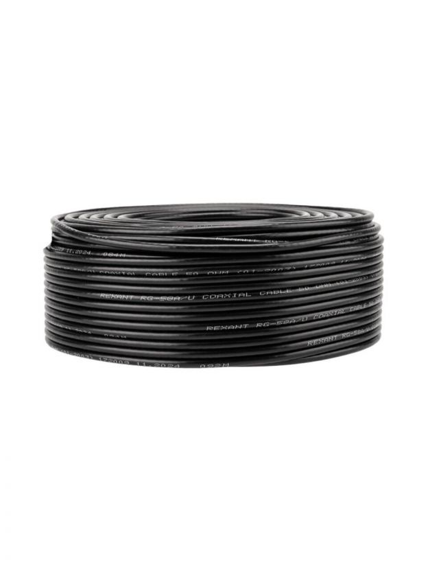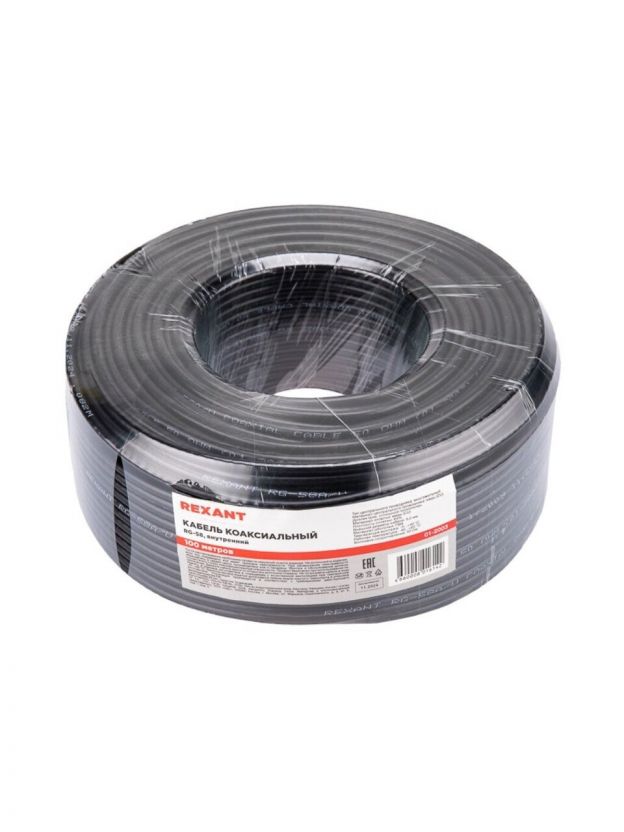 Кабель коаксиальный, 1х0.51 мм2, 100 м, медь, 50 Ом, 64%, черный, Rexant, RG-58 A/U, 01-2003