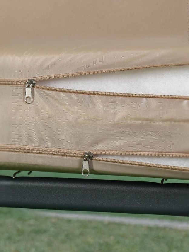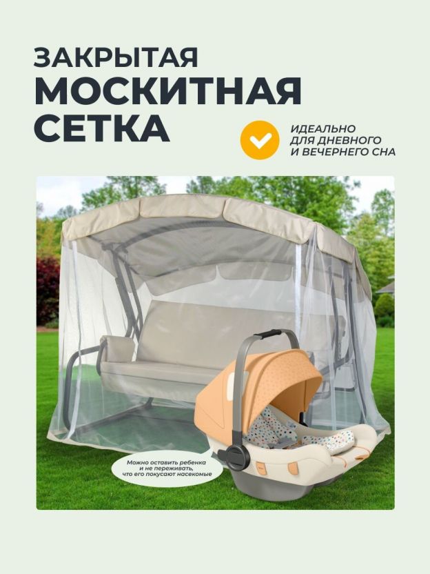 Особенности конструкции позволяют трансформировать качели в удобную кровать, что добавляет им функциональности и делает их идеальным решением для тех, кто ценит универсальность и комфорт. В комплекте идет москитная сетка, которая защитит от назойливых насекомых, обеспечивая спокойный отдых на свежем воздухе.