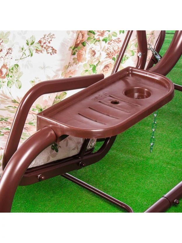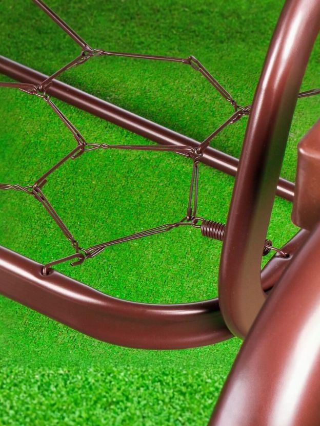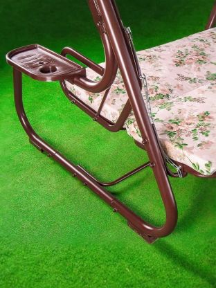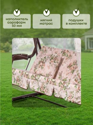 Качели оснащены мягким сиденьем и спинкой с наполнителем из аэрофома, а подушки наполнены синтепоном, что обеспечивает комфорт на протяжении всего времени использования. Размеры сиденья и спинки (178х53 см) позволяют удобно разместиться трем взрослым. Тент из плотной ткани (130 г/м2) надежно защищает от солнечных лучей, а дугообразная форма опоры придает конструкции устойчивость и современный вид.