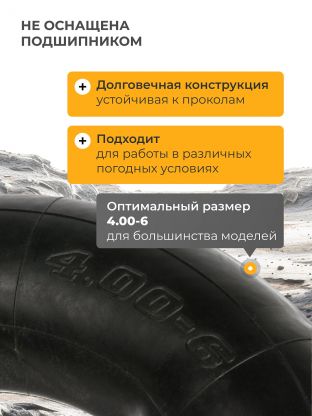 - Универсальность — подходит для большинства строительных и садовых тачек с размером шины 4.00-6;