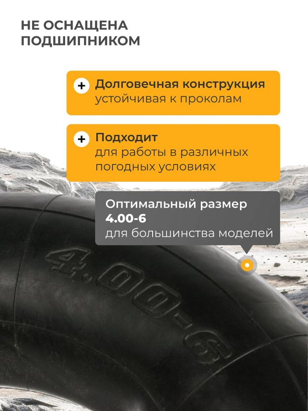 Камера изготовлена из прочной резины, не имеет подшипника, подходит для шин 4.00-6, легко устанавливается и рассчитана на долгий срок службы даже при интенсивной эксплуатации.
