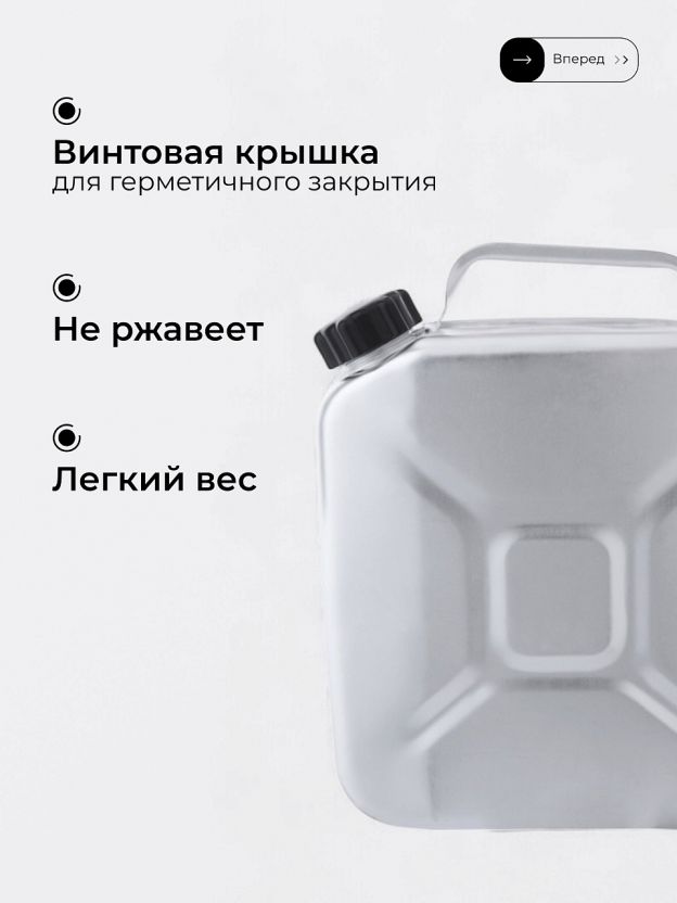 • Легкий алюминий — не ржавеет, не деформируется, подходит для длительного хранения бензина и солярки;
