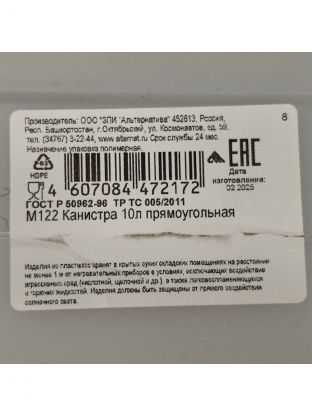Канистра пластик, 10 л, прямоугольная, в ассортименте, М122, Альтернатива