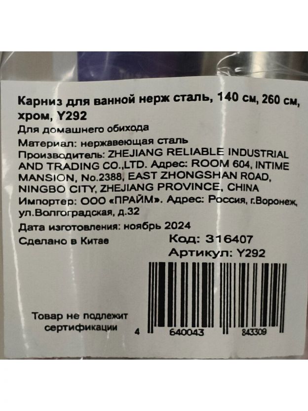 Карниз для ванной нержавеющая сталь, 140 см, 260 см, телескопический, хром, Y292