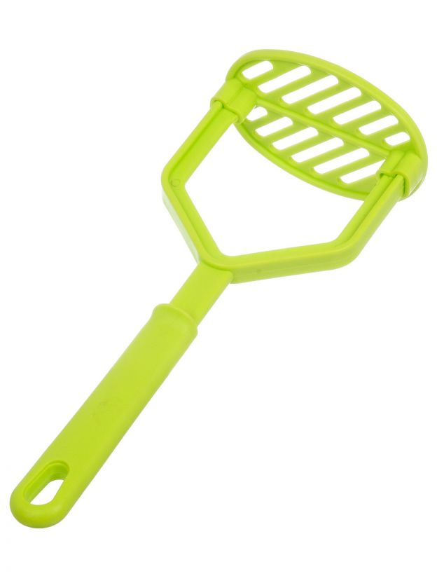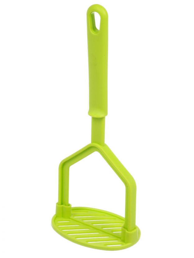 Стандартная длина — удобно держать в руке, рабочая часть оптимальна для разминания средних и крупных порций овощей. Материал — нейлон, цвет — лайм, предусмотрена навеска для хранения.