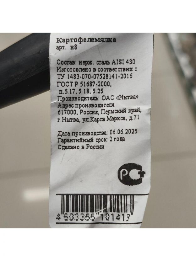 Картофелемялка кулинарная, нержавеющая сталь, 25 см, навеска, Добросталь/Нытва, Н8, навеска