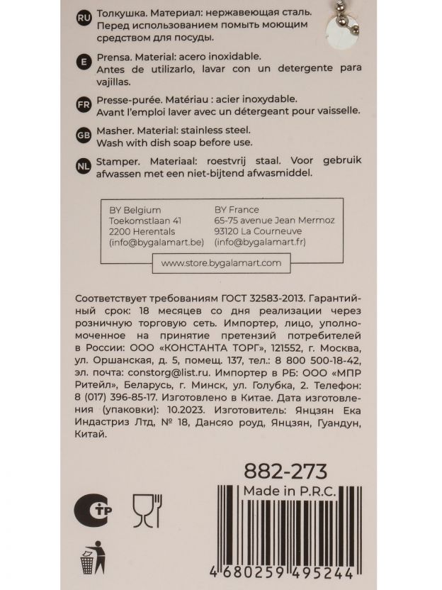 Картофелемялка нержавеющая сталь, 26х8 см, навеска, Satoshi, Имари, 882-273