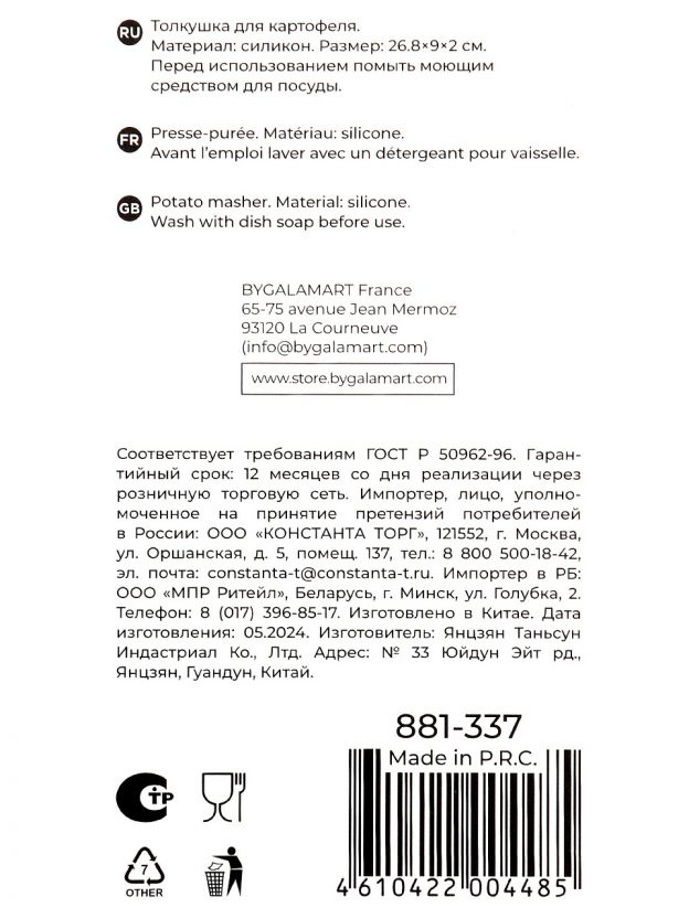 Модель Satoshi Ривьера с навеской удобна для хранения — просто подвесьте её на рейлинг или крючок. Размер 26.8х9 см оптимален для разных объёмов, а ручка не скользит даже во влажной руке. Можно мыть в посудомоечной машине, что облегчает уход и экономит время. Если вы ищете, какую картофелемялку купить для дачи или в подарок, обратите внимание на долговечность силикона и универсальность использования.