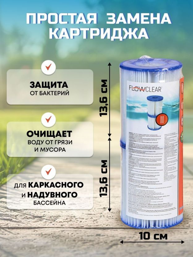 Картридж Bestway II обладает большой площадью фильтрации, что позволяет ему эффективно улавливать и удерживать загрязнения и примеси. Это обеспечивает долгосрочную чистоту и свежесть воды, что особенно важно в летний период, когда бассейн используется наиболее активно. Размер картриджа составляет 10х13.6 см, что делает его идеально подходящим для упомянутых моделей фильтр-насосов.