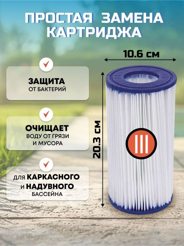Откройте для себя идеальное решение для поддержания чистоты воды в бассейне с картриджем для фильтр-насоса Bestway III. Этот продукт создан для тех, кто ценит качество и эффективность, обеспечивая надежную фильтрацию и долговечность. Замените старый картридж на новый и наслаждайтесь кристально чистой водой без усилий.