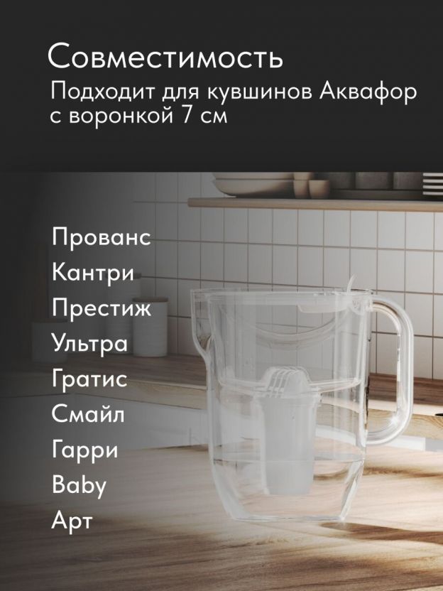 - Картридж совместим с кувшинами Аквафор с воронкой 7 см: Прованс, Кантри, Престиж, Ультра, Гратис, Смайл, Гарри, Арт, Baby.