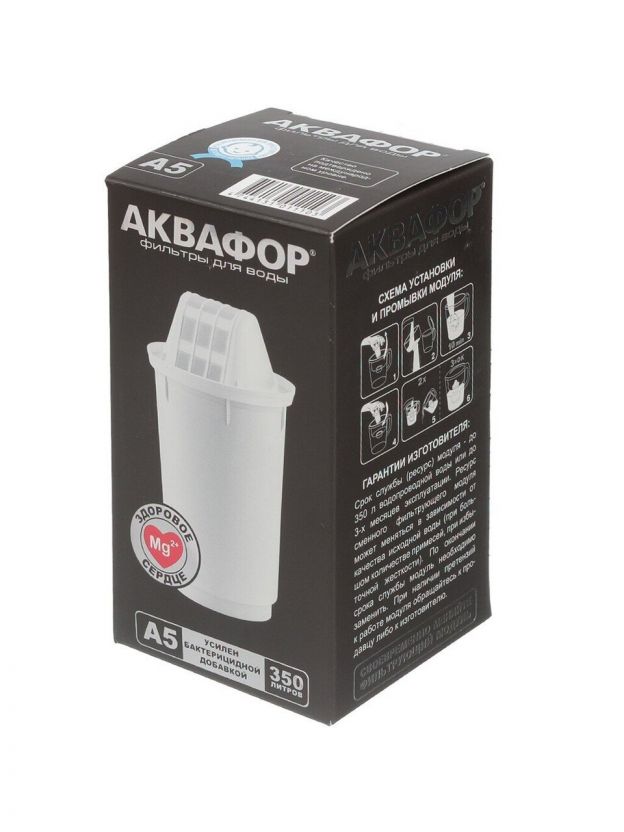 Картридж А5 содержит природный минерал - перламутровый доломит, который сохраняет магний. Он легко усваивается и предотвращает заболевания сердца и сосудов. Используется в кувшинах Аквафор c круглым гнездом посадки картриджа диаметром 7 см: "Аквафор Арт", "Аквафор Гарри", "Аквафор Гратис", "Аквафор Кантри", "Аквафор Премиум", "Аквафор Престиж", "Аквафор Триумф", "Аквафор Ультра".