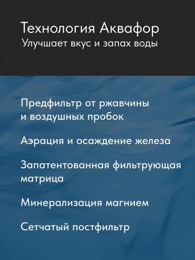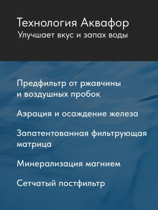 - Технология смягчения и защита от накипи — чистая вода без постороннего привкуса и осадка.