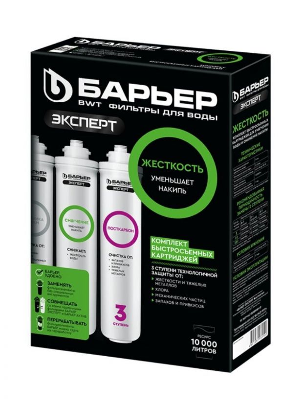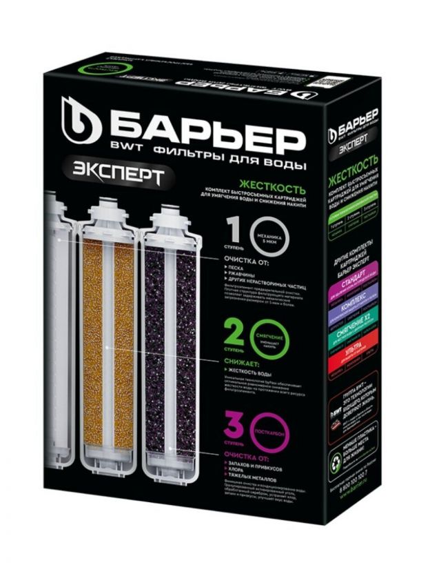 Комплект сменных фильтроэлементов для комплексной очистки жесткой воды от всех основных содержащихся в ней вредных примесей. Устанавливается в проточный фильтр Эксперт Жесткость.