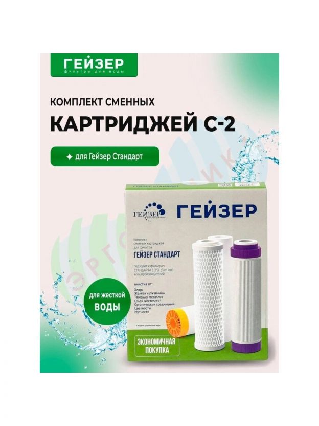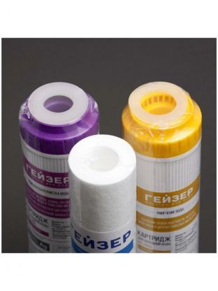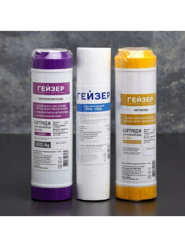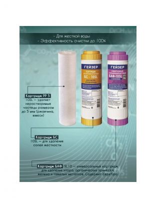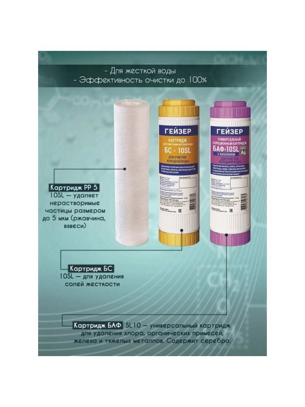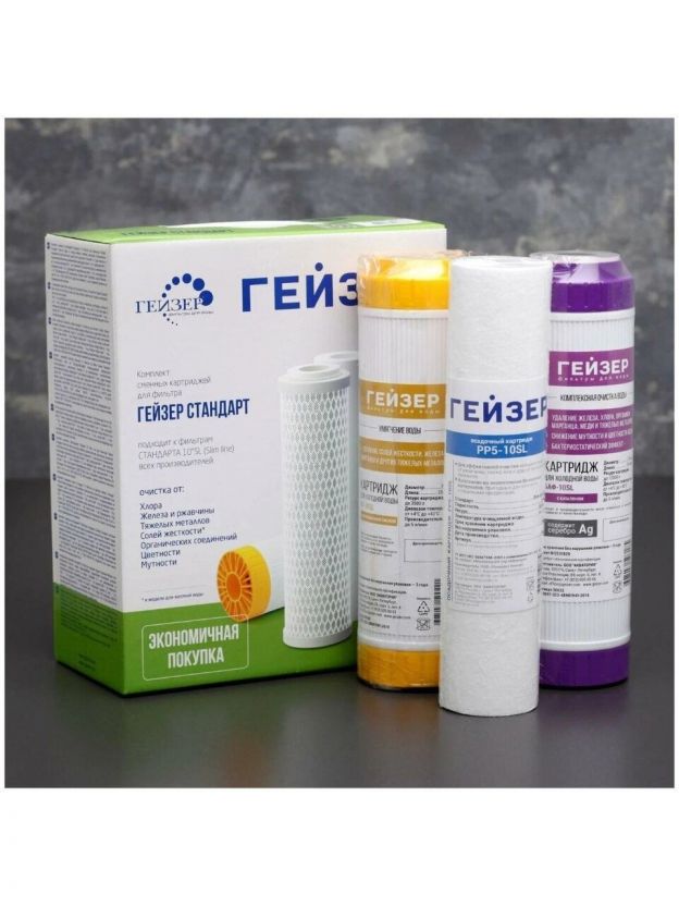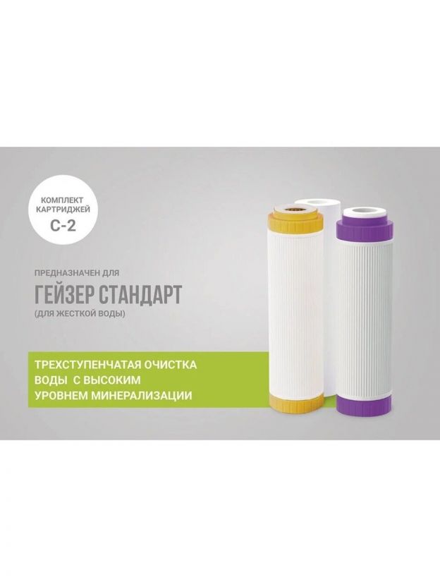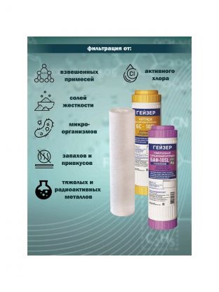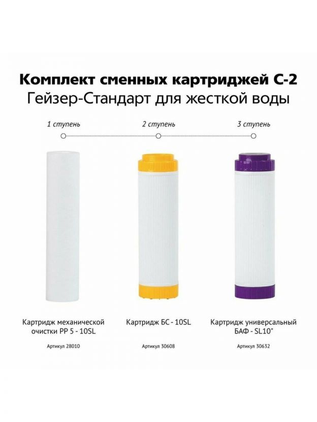 Комплект сменных картриджей Гейзер С-2 для фильтра Гейзер-Стандарт для жесткой воды. Картридж PP 5 - 10SL - удаляет нерастворимые частицы размером до 5 мкм (ржавчина, взвеси). Картридж БС - 10SL - для удаления солей жесткости. Картридж БАФ - SL10 - универсальный картридж для удаления хлора, органических примесей, железа и тяжелых металлов. Содержит серебро. Замена картриджей для семьи из 3-4 человек в среднем 1 раз в год.