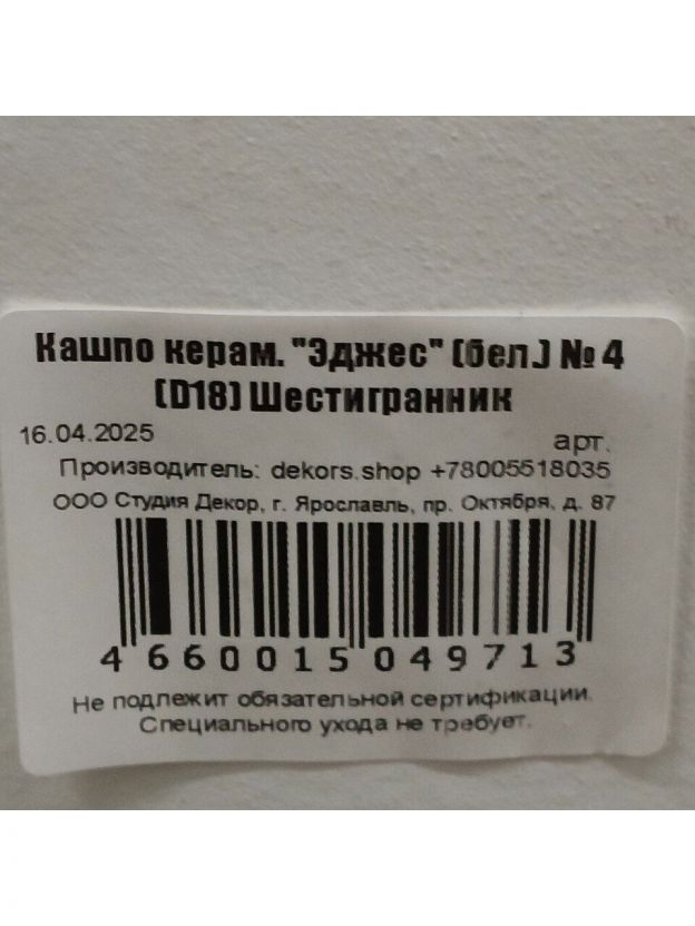 Кашпо керамика, 2.5 л, 18х13.5 см, шестигранник, белое, Эджес №4, 049713