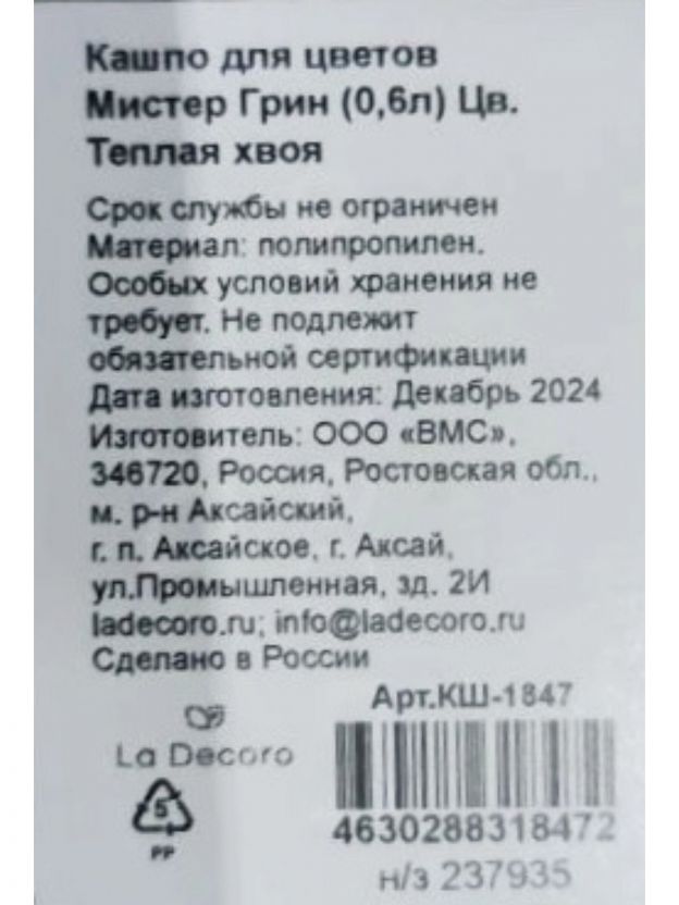 Кашпо пластиковое 0.6 л La Decoro Мистер Грин — это универсальный выбор для тех, кто ищет недорогое кашпо для дома, офиса или в подарок. Благодаря компактным размерам (11.1x11.1x8.8 см) и фигурной форме, оно отлично подходит для фиалок, суккулентов, кактусов и других миниатюрных растений. Цвет «тёплая хвоя» гармонично впишется в современный интерьер, а лёгкий пластик обеспечивает удобство перемещения и ухода.