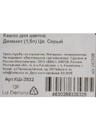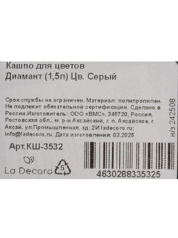 Кашпо La Decoro Диамант 1.5 л, серый — компактное решение для стильного интерьера и здоровых растений. Прочный пластик, современный дизайн, выгодная цена.