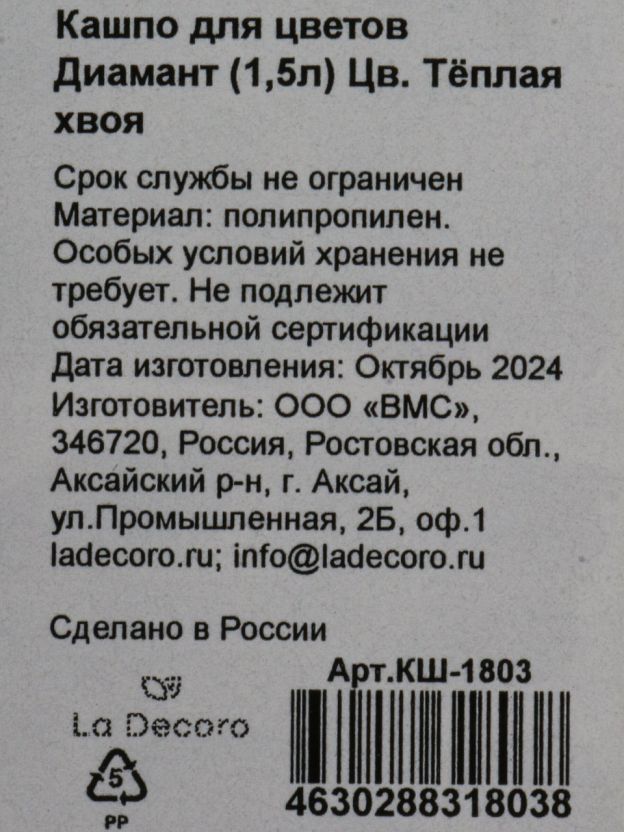 Выбирайте кашпо La Decoro Диамант 1.5 л — закажите онлайн с быстрой доставкой и получите стильный аксессуар для ваших растений по выгодной цене. Гарантия качества и актуальный дизайн — для вашего уюта и вдохновения.