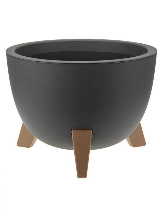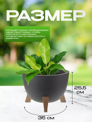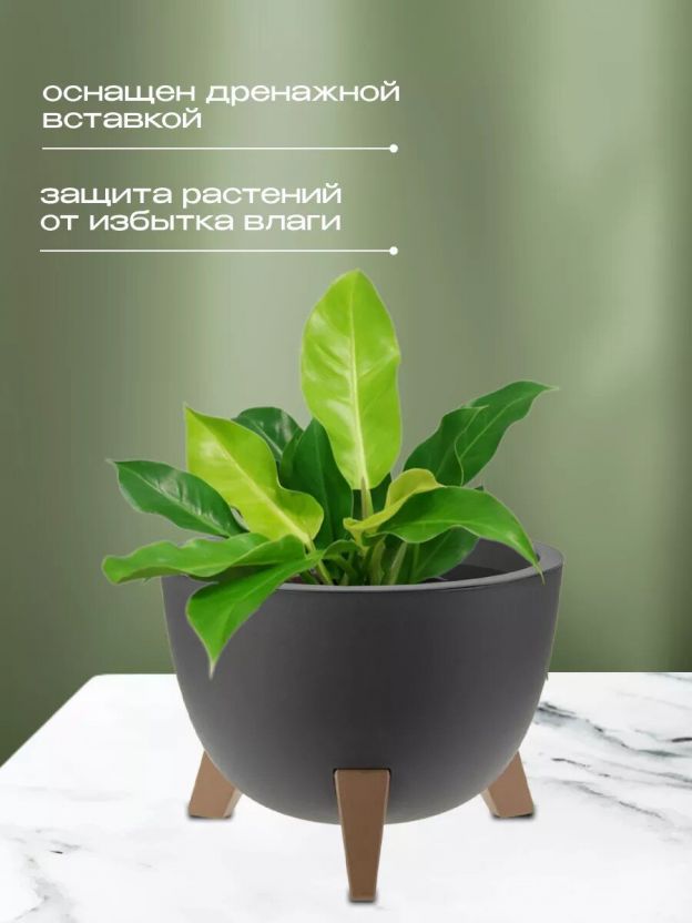 Кашпо со вставкой на ножках имеет круглую форму и матовую поверхность.