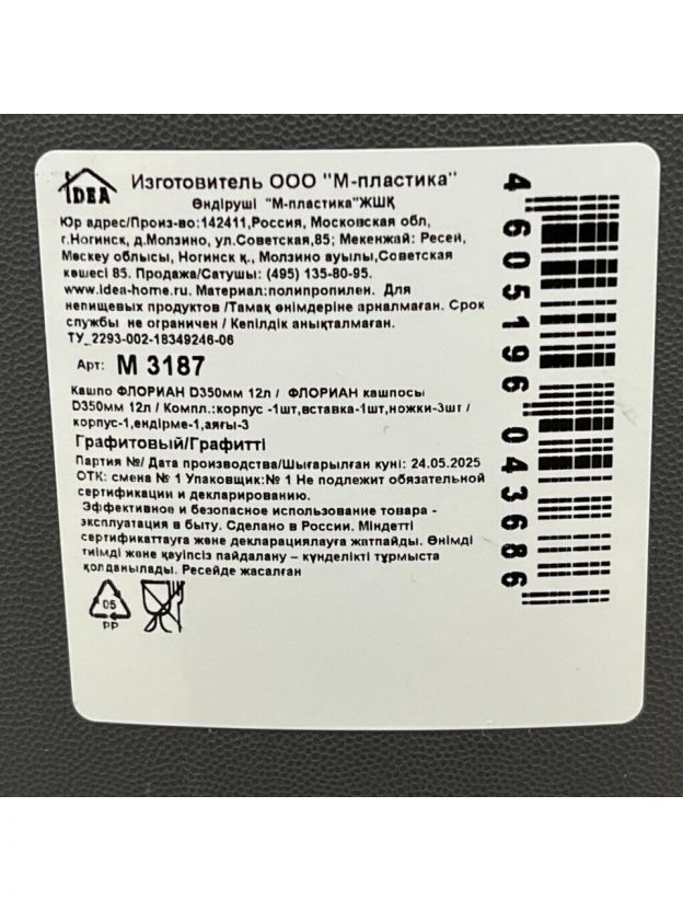 Кашпо пластик, 12 л, 35х25.5 см, графит, Idea, Флориан, М 3187