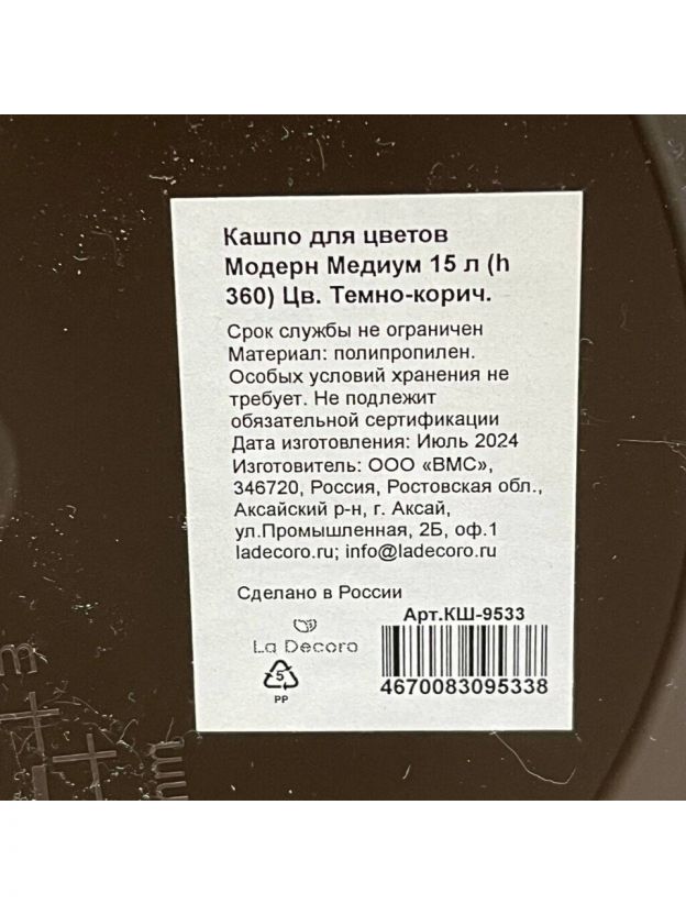 Кашпо пластик, 15 л, 36 см, универсальное, темно-коричневое, Модерн Медиум, КШ-9533