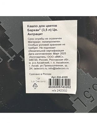 Кашпо пластик, 3.5 л, универсальное, антрацит, La Decoro, Бархан, КШ-4320
