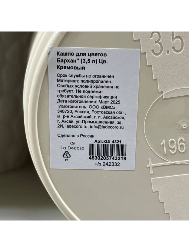 Кашпо пластик, 3.5 л, универсальное, кремовое, La Decoro, Бархан, КШ-4321