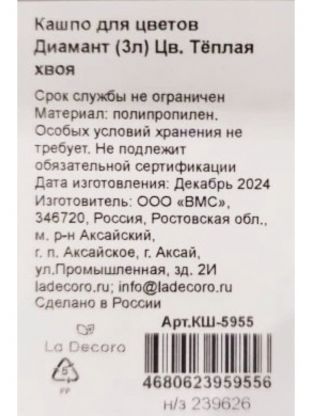 Кашпо пластик, 3 л, 17.7х17.7х16.5 см, универсальное, теплая хвоя, La Decoro, Диамант, КШ-5955