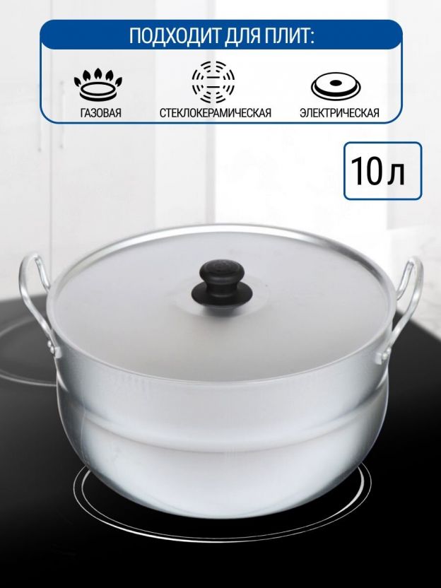 Часто спрашивают, подходит ли кастрюля для индукционной плиты — данная модель рассчитана на газовые, электрические и стеклокерамические поверхности. Выбирая объем, ориентируйтесь на количество членов семьи и задачи: 10 л — оптимально для заготовок, больших компаний, приготовления компота на даче.