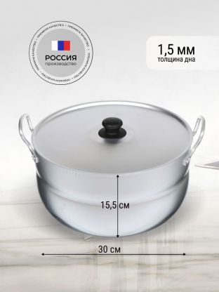 Объем — 10 литров, диаметр — 34 см, диаметр дна — 28 см, толщина дна — 1,5 мм, вес — 1,1 кг, крышка алюминиевая в комплекте.