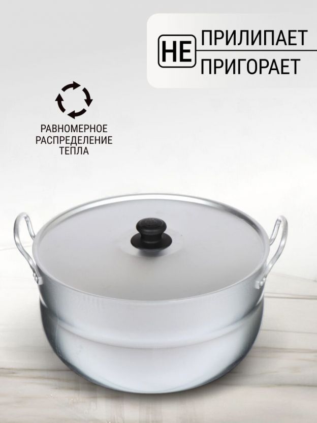 Кастрюля Калитва 10 л — популярный выбор для тех, кто ищет, какую кастрюлю купить для больших объемов. Алюминий быстро и равномерно нагревается, что экономит время на приготовление супа, макарон или компота. Благодаря отсутствию антипригарного и эмалированного покрытия, кастрюля не боится царапин, а внутреннюю поверхность легко очищать даже после варки пельменей или борща.