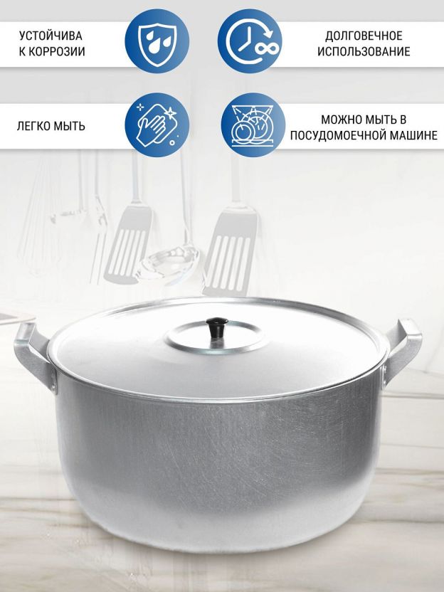 Алюминиевая кастрюля применяется для приготовления различных блюд, изготовлена из пищевого алюминия, проста в уходе, быстро и равномерно нагревается. Ее преимуществами являются легкость в уходе, высокая устойчивости к царапинам, а так же возможность использования металлических аксессуаров. Поставляется вместе с крышкой соответствующего диаметра.