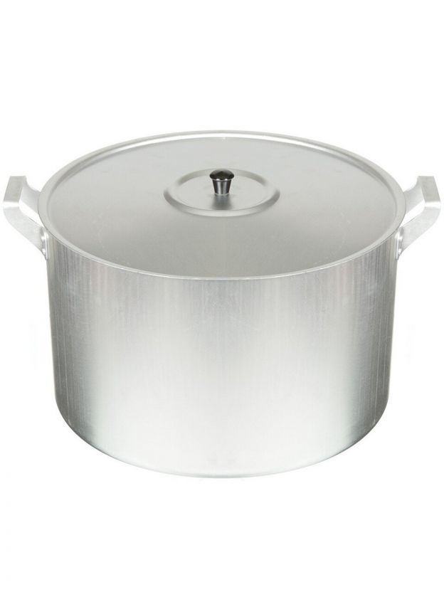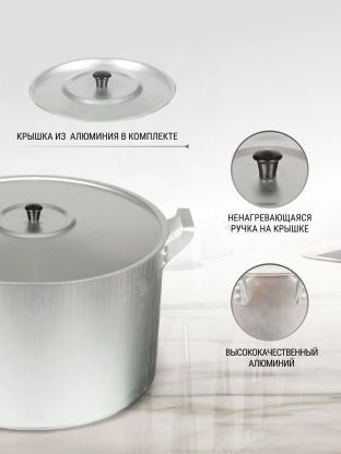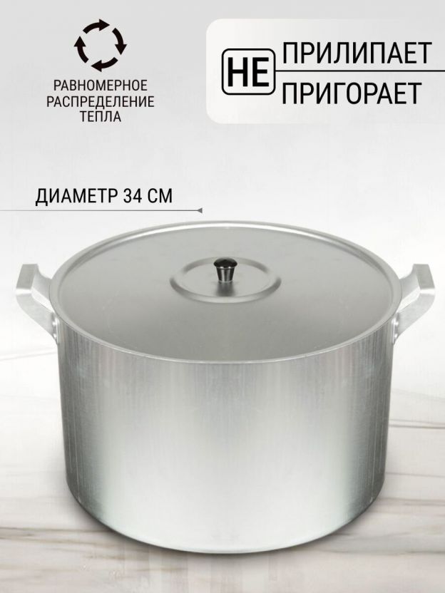 Кастрюля рассчитана на 20 литров, диаметр и дно — 34 см, высота с крышкой — 24,5 см. Отлично подходит для супов, макарон, пельменей, компотов и заготовок на зиму.